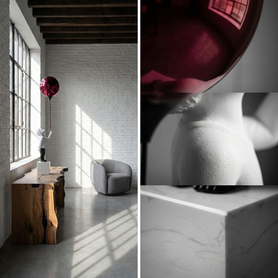 AeroCherub is a study in structural and philosophical balance. The metal balloon embodies the characteristics of hope: light and naturally ascending. Yet, rather than depicting an untethered ascent, the form is grounded by a heavy marble base. This creates a deliberate aesthetic paradox by The Soft Minimal. It visually articulates a profound human necessity: to prevent hope from becoming a mere illusion, it requires a practical anchor; and to prevent reality from becoming desolate, it requires the elevation of hope.