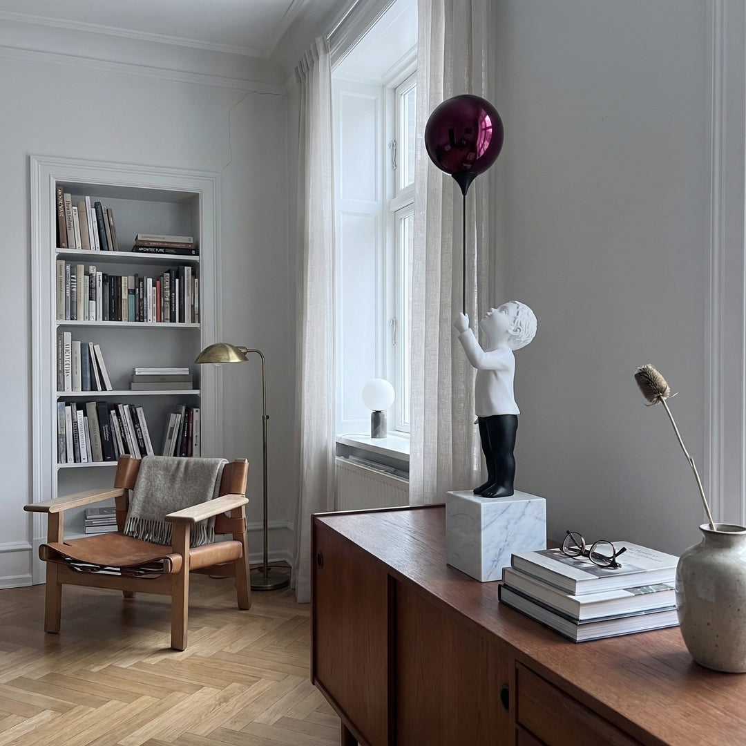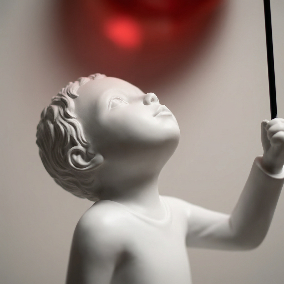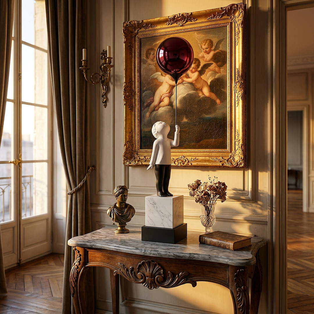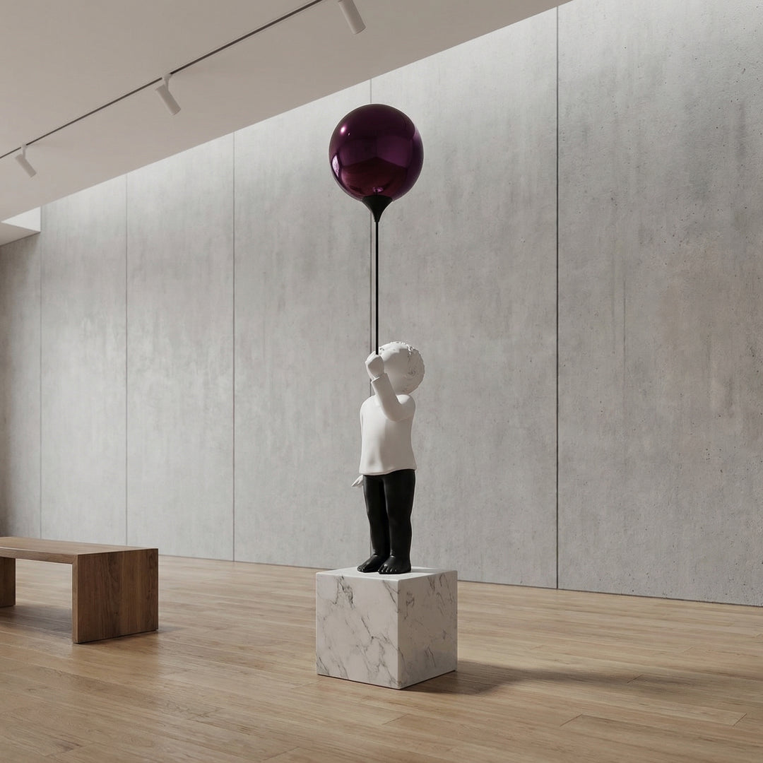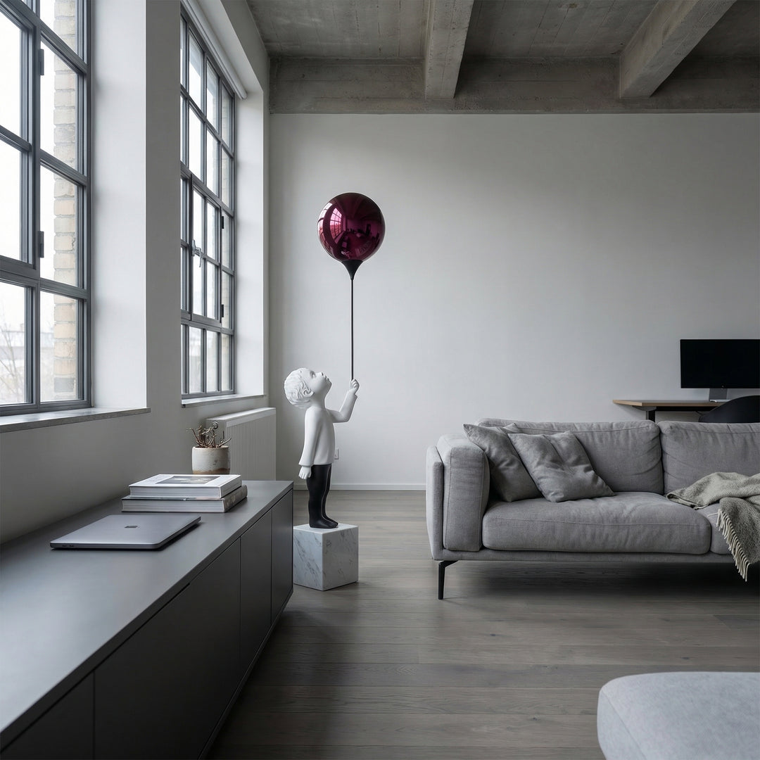 In the realm of environmental psychology, the modern habitat is often plagued by "attention fatigue" a state of cognitive exhaustion caused by relentless external stimuli and digital saturation. AeroCherub is strategically positioned to counteract this modern affliction. It functions as a psychological anchor within the living space. By offering an aesthetic of absolute stillness, the figure of the child holding the balloon demands nothing from the viewer, yet provides a profound point of visual and mental rest. It interrupts the chaotic, forward-moving flow of daily life, inviting a brief but essential journey inward. This meditative pause allows the nervous system to recalibrate, transforming the sculpture from a mere decorative object into a crucial instrument for mental recovery and spatial healing.