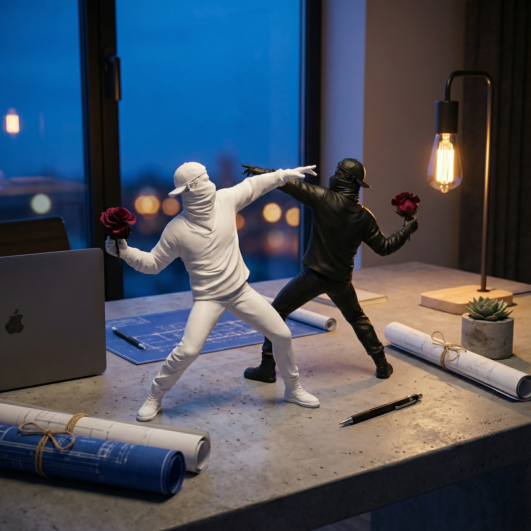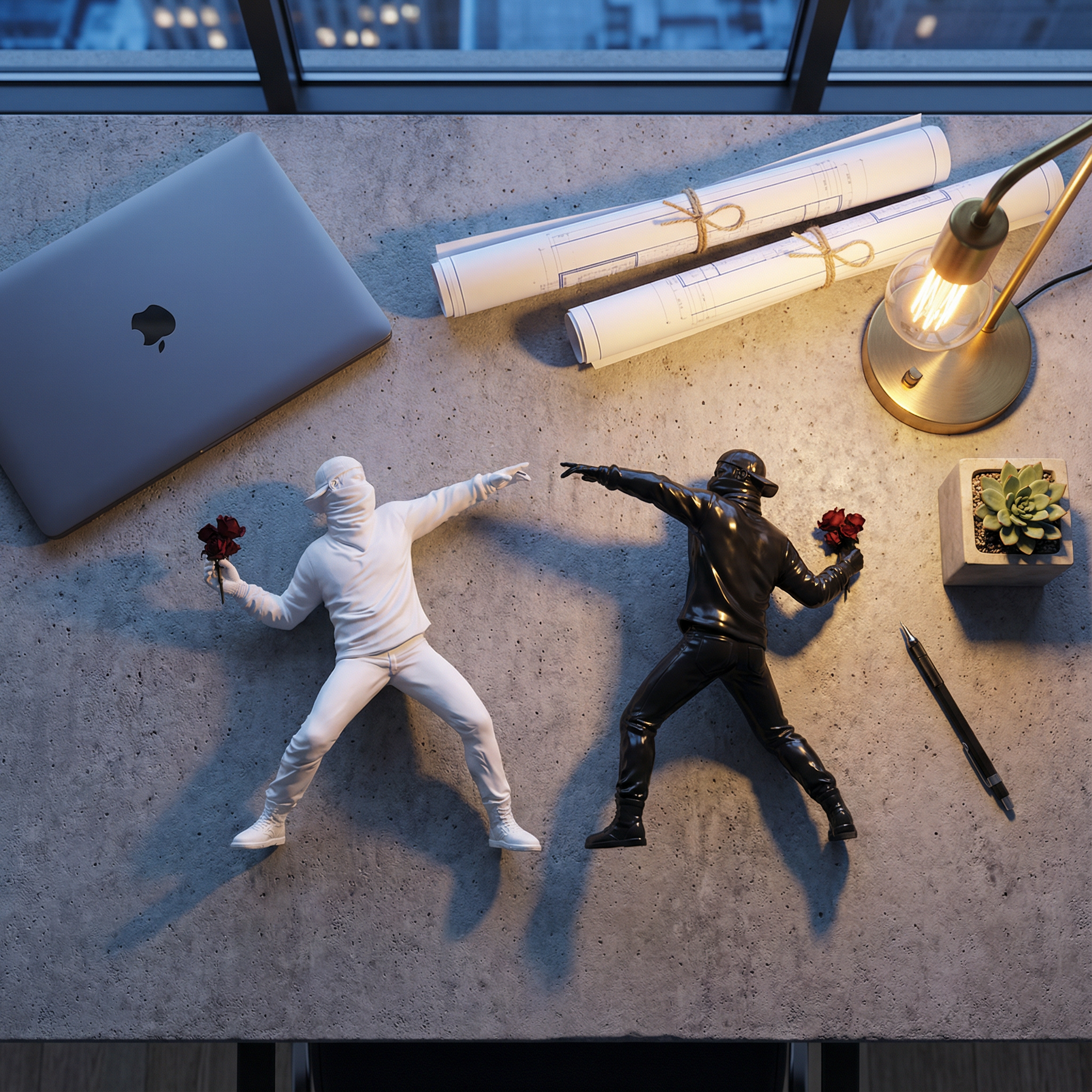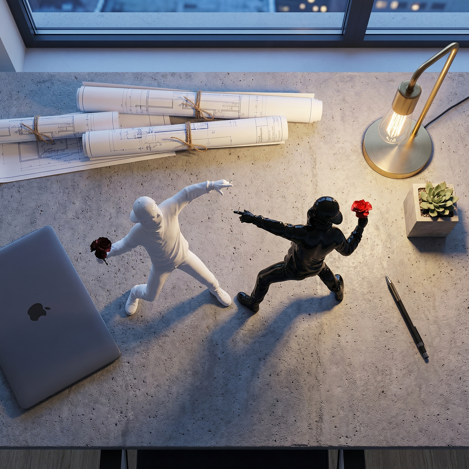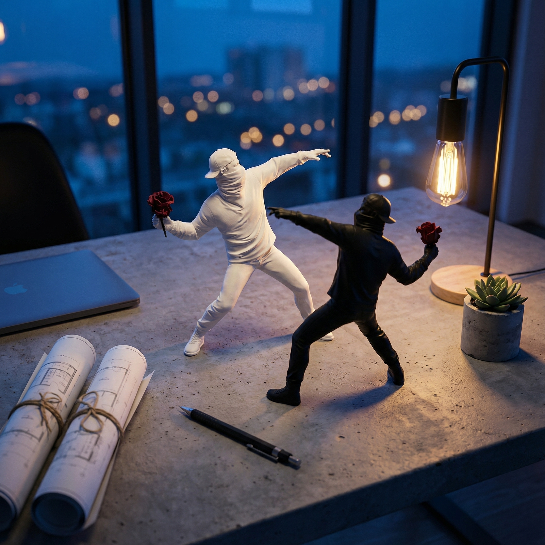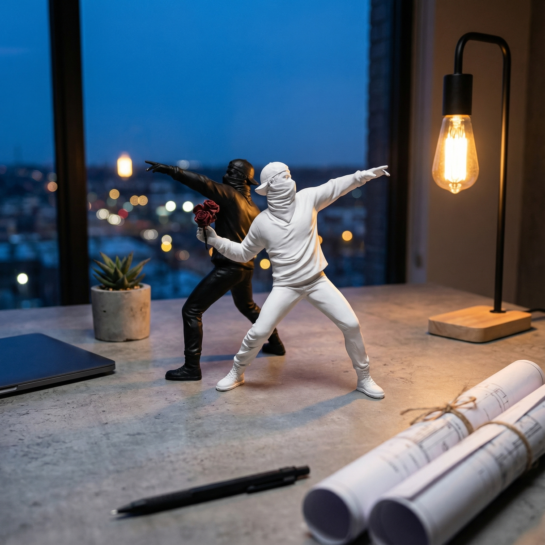 Thrive is a compelling abstract expression of modern conflict and compassion, featuring two figures in stark White and Black contrast (Colors). This duality is the ultimate study in Soft Minimal balance: the sharp defiance of the pose is harmonized by the organic beauty of the flower. The vivid expression and detailed posing (Design) capture the intensity of the moment with profound elegance.