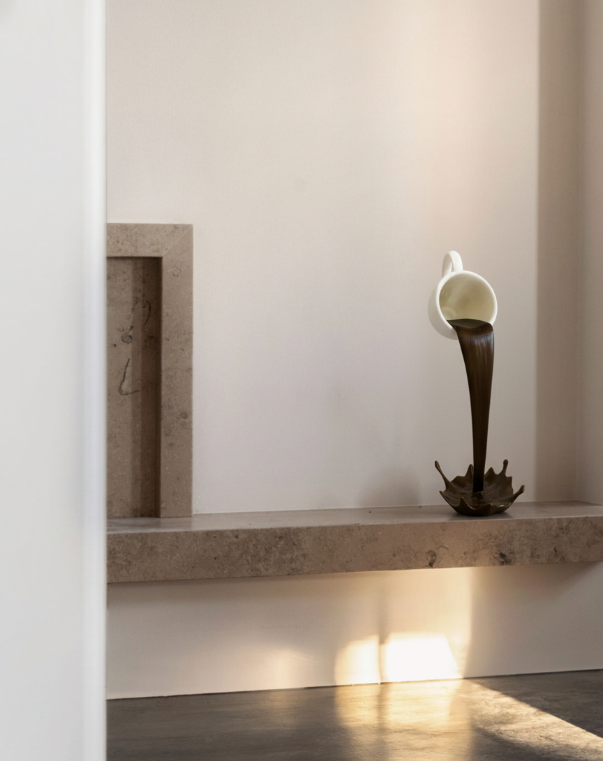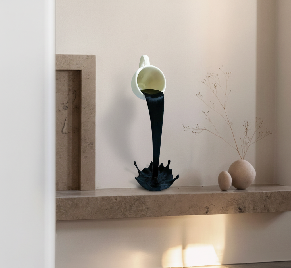 "CaffèInAria" – a name thoughtfully combining the Italian "caffè" (coffee) and "aria" (air) – is a captivating sculpture full of surprise and delight. It masterfully captures the magical, suspended moment of a coffee cup floating and pouring mid-air, transforming a familiar daily ritual into a mesmerizing illusion.