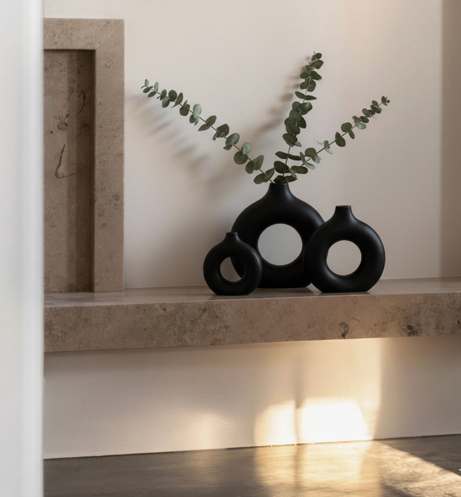 Enhancing Alcoves or Wall Shelves: Should your space feature recessed wall niches or simple floating shelves, placing a Circlet within them can transform these often-overlooked areas into artistic focal points. Natural light or subtle indirect lighting can beautifully highlight the vase's form and material, creating an impressive yet understated visual effect.