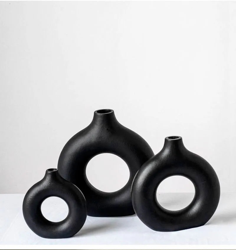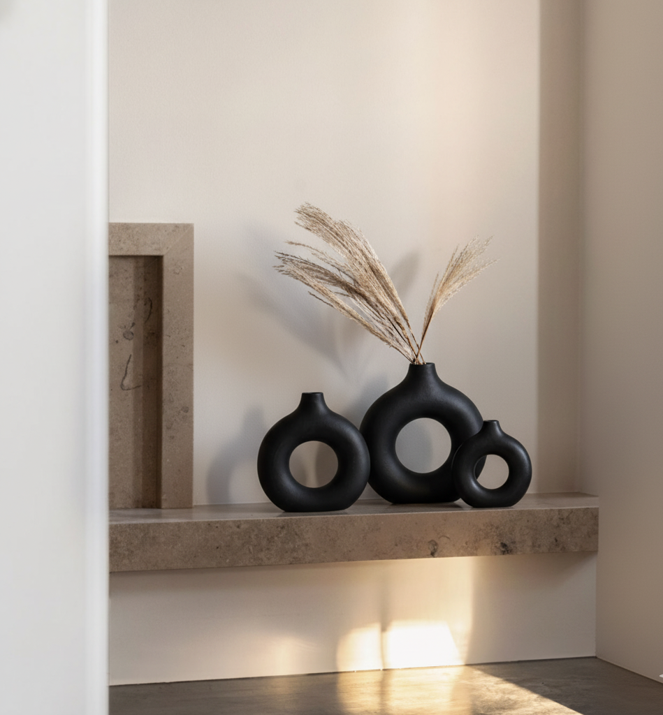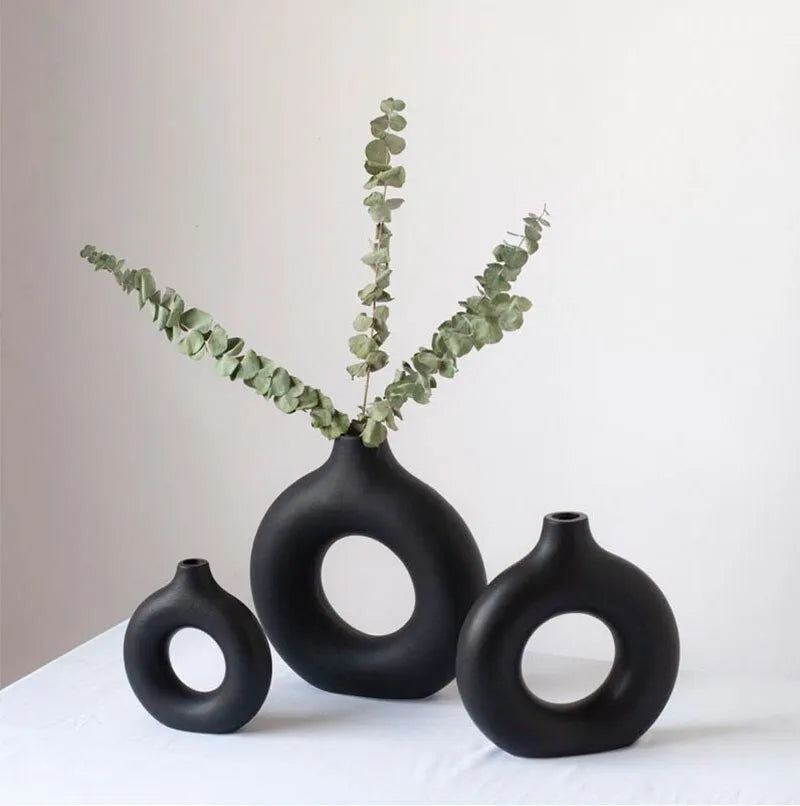 Harmonious Arrangement for Dining or Coffee Tables: Arrange a complete set of three Circlet vases, varying in size, as a centerpiece for your dining or coffee table. Consider accentuating them with slender dried botanicals such as Eucalyptus leaves, Pampas grass, or delicate wheat stalks. This combination not only adds depth and rhythm to the composition but also evokes an organic beauty and connection to nature, infusing your gathering spaces with warmth and tranquility.
